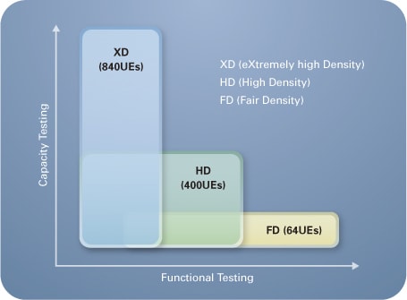 ユーザの多様な開発ターゲット(eNB Capacity)に対応し、XD (eXtremely high Density) ・HD (High Density)・FD (Fair Density)の3システムを用意しました。XDは最高840 UEs/sectorまでの過負荷試験を可能とするシステムで、商用eNBの早期開発段階において業界初の実機接続試験に成功し、現在に至るまで、市場を独占し続けている強力なシステムです。一方、FDは64 UEs/sectorをサポートし、より機能試験に特化すると同時に抜群のコストパフォーマンスを実現しています。HDは400 UEs/sectorの標準的キャパシティテストを実現しながらFDの機能試験を部分的に実装しています。もちろん、すべてのリソース(試験データ)はXD/HD/FDの3システム間で共有可能です。Figure1にXD/HD/FDのカバーする領域を、Figure2/3にシステムコンフィギュレーションを示します。