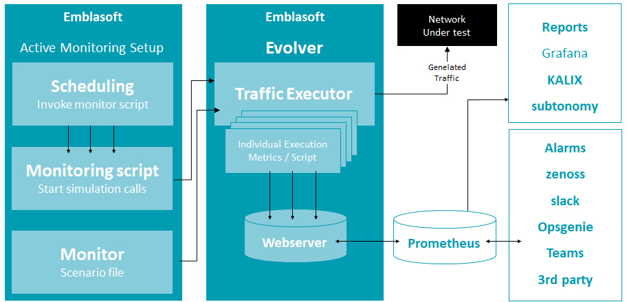Evolverは、機能テストおよびパフォーマンス・テストに加え、中央のコントロール・プラットフォームから制御されるソフトウェア・エージェントを展開することにより、アクティブ・モニタリングもサポートします。これらのエージェントは、ネットワークのどのドメインにも動的に、必要に応じてインストール可能で、実際のトラフィックセッションを生成し、差別化されたサービスやアプリケーションに対する死活監視、QoS(サービス品質)を測定します。これにより特定のサービスに対し、詳細なシナリオの下でアクティブなトラフィック・フローを効率的かつコスト効果の高い方法で保証し、スケーラブルな検証手段が可能であり、障害の予防、ダウンタイムの最小化を提供します。